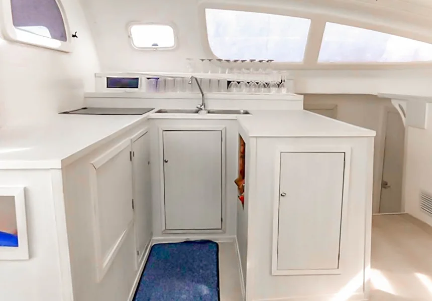 The catamaran features two cabins and two bathrooms, providing convenience throughout your trip. In addition, it offers two large sunbathing nets at the front for guests who love relaxing under the Caribbean sun. Meanwhile, shaded seating areas at the stern provide comfort for those who prefer cover. Therefore, every guest finds their perfect spot onboard.