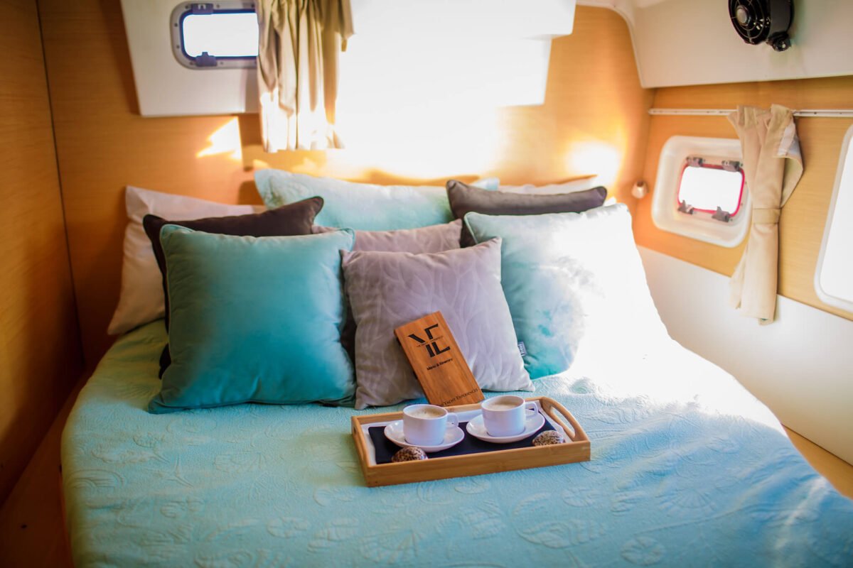 The yacht features four cabins and four bathrooms, allowing guests to relax in privacy. Therefore, longer charters feel just as comfortable as a luxury villa on the water.