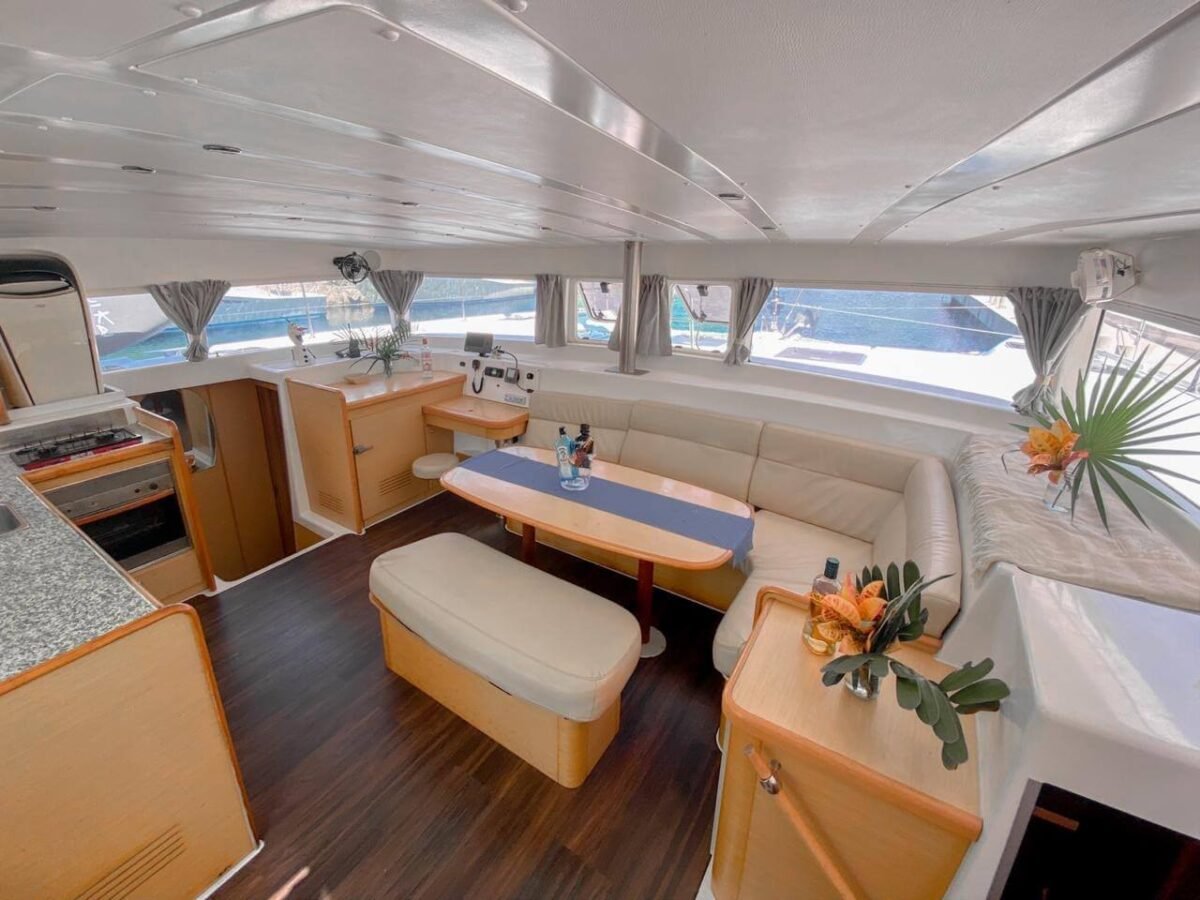 This catamaran is designed for stability, space, and smooth cruising. Because of its double hull structure, it minimizes motion and delivers a calm ride even on open water.