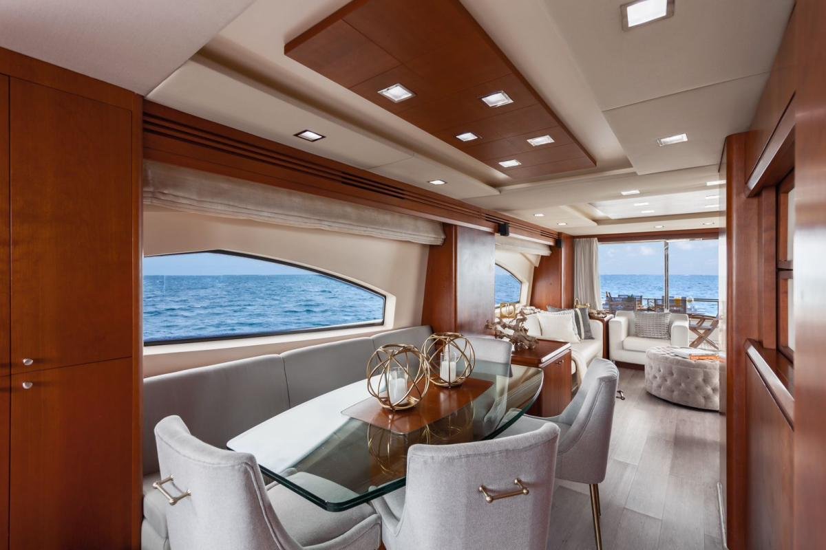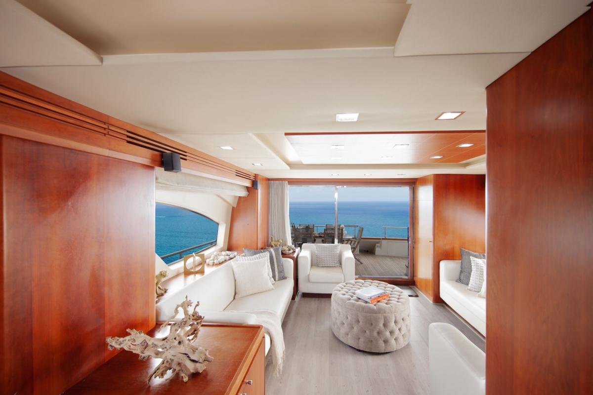Inside, the yacht features a cool, modern salon with large windows and comfortable seating. This space offers a refreshing escape from the sun while still keeping you connected to the sea views.