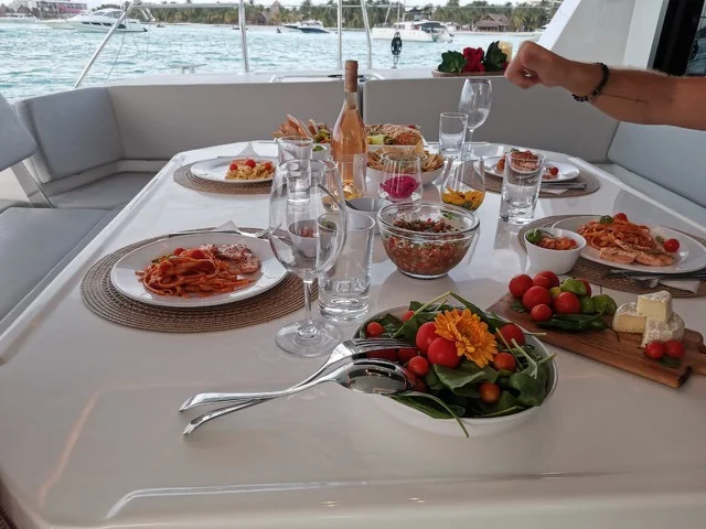 For extended 7 hour charters you may add a buffet lunch to elevate your experience. The smooth twin hull design ensures stability and comfort while you sail from Cancun to Isla Mujeres.